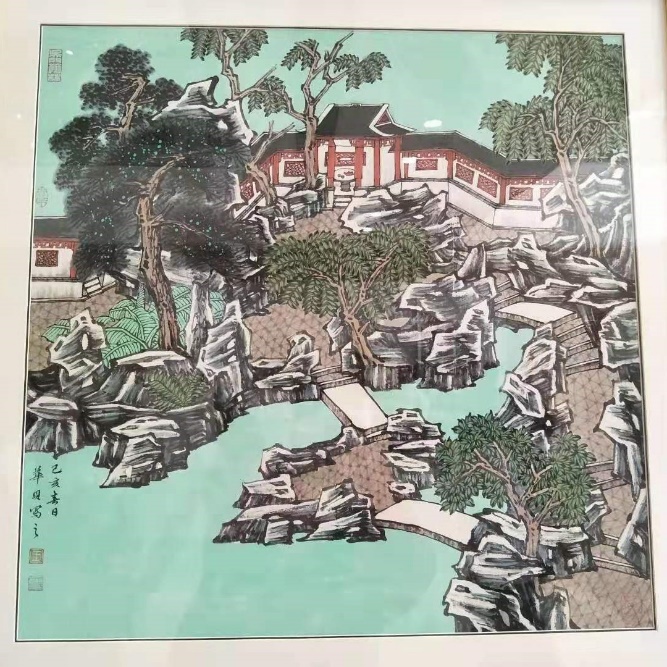 Suzhou is famous for its gardens and the painting showcases 3 out of the 69 gardens, which are theHumble Administrator’s Garden(拙政园),the Master of Nets Garden (网师园)and the Mountain Villa with Embracing Beauty(环秀山庄). Although the gardens of Suzhou seem similar, they each have their own uniqueness. Thus, an artist can choose the angle and part of the gardens that suit their intention. Furthermore, Mr Wang said that in his landscape artworks, the colours and styles used to draw the rocks and mountains vary; which in turnresults in a vast array of different experiences received by viewers. Hence, different geographical locations would result in different colours being used.